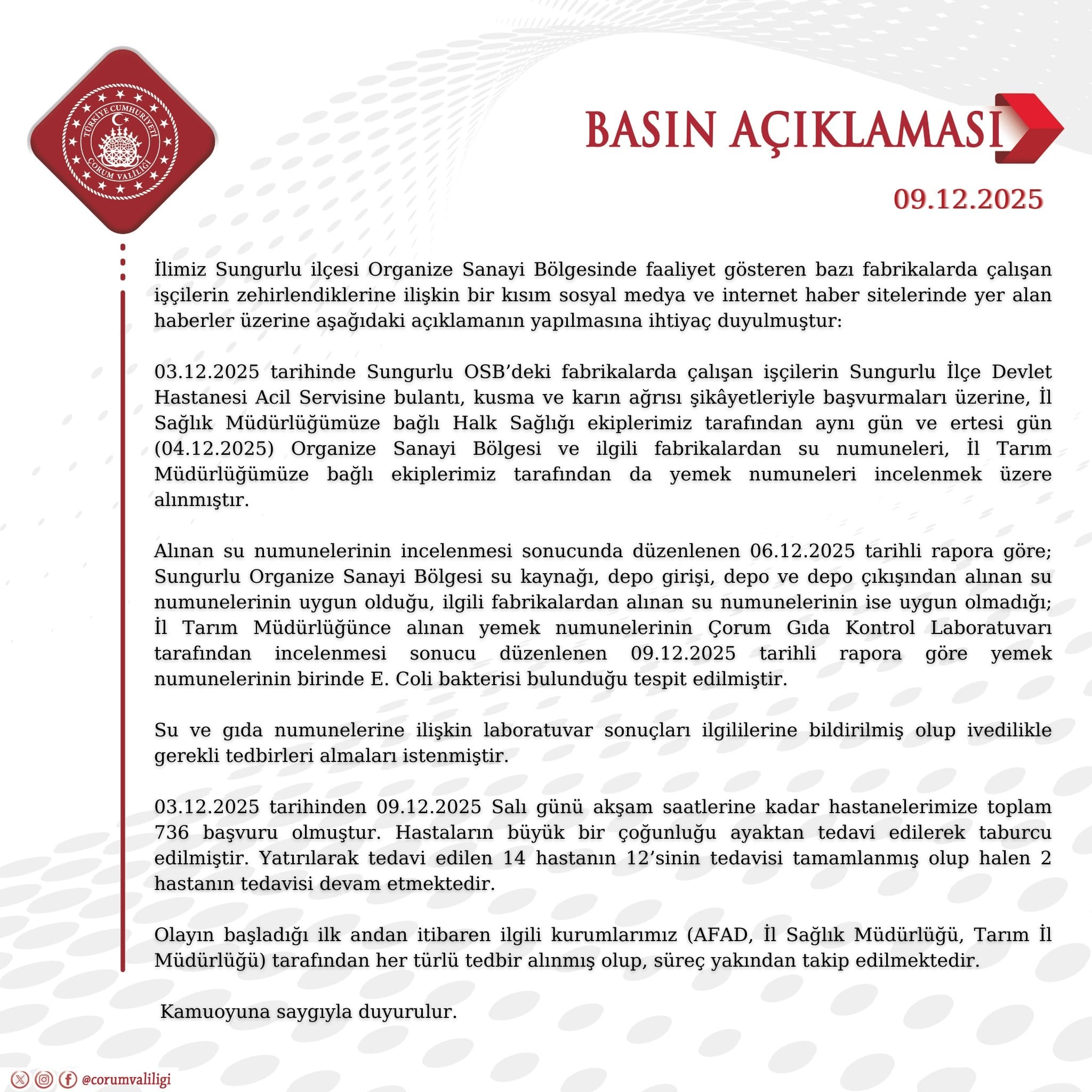 Çorum Valiliği, laboratuvar incelemelerinin sonuçlarını 10 Aralık 2025 tarihli basın açıklamasıyla kamuoyuyla paylaştı: