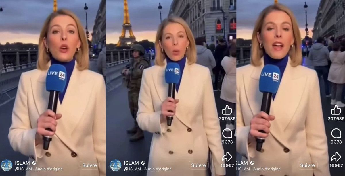 “Live 24” adlı gerçekte var olmayan bir haber kanalının logosuyla paylaşılan videoda, bir muhabir Eyfel Kulesi önünde polis ışıkları ve helikopter hareketliliği eşliğinde “kimliği belirsiz bir albay önderliğinde darbe yapıldığını” duyuruyordu.